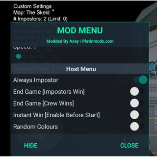 Among us mod menu modded by axey platinmodscom. Among Us lately become a extremly by famous games, perhaps it is because its very addictive game to play. Becoming an impostor are the dream by every player in Among us mod menu modded by axey platinmodscom game. Because you can kid your friend and It is funny to see friends fighting each other to vote for the impostor, and sometimes they start of to fight which player Is the true Impostor Among Us Mod Menu Modded By Axey Platinmodscom.